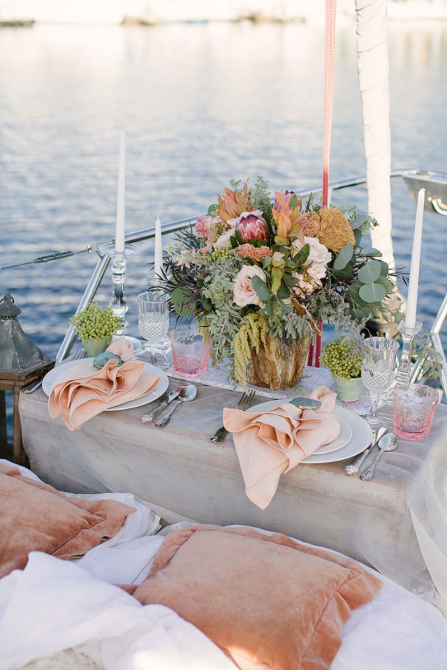 The event's theme also plays a key role in the choice of colors, materials, and decorative elements. Nautical, tropical, bohemian, and elegant minimalist styles are some of the most popular. Lighting, textiles, natural flowers, and portable furniture are key resources that allow you to personalize every corner of the boat without compromising mobility or safety.