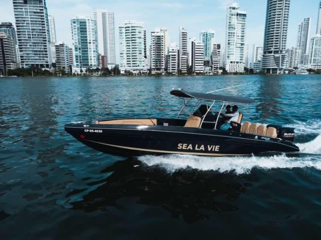 Discover the elegance and power of Sea La Vie, a boat designed for those seeking a premium nautical experience in Cartagena. Its imposing black hull with gold details reflects sophistication and modernity, making it the ideal option for touring the Caribbean waters in total comfort. Equipped with padded seats in beige tones, ample space to relax and a bimini top that provides shade on sunny days, Sea La Vie is perfect for enjoying a carefree day at sea. In addition, its open and ergonomic design allows for comfortable movement for all passengers.