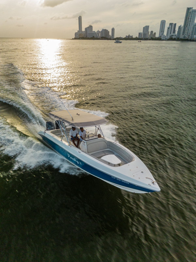 The Ponky II is a 30-foot boat with capacity for 12 passengers, designed to offer comfort and space during navigation. Its layout allows you to enjoy the trip in total comfort, as it has seating areas both at the bow and at the stern, ideal for relaxing and admiring the landscape. In addition, at the bow there is a table perfect for sharing special moments on board. The cushions are in perfect condition, providing an elegant and comfortable environment, while the roof at the stern provides shade, allowing you to enjoy the trip without worrying about sun exposure. Whether to tour the Rosario, Barú or Cholón Islands, or for a walk around the bay of Cartagena, the Ponky II guarantees an unforgettable experience at sea.