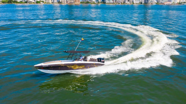 Its sophisticated design in black and gold tones stands out in the water, while its premium grey leather seats with gold details offer an exceptional comfort experience. For lovers of good music, the Bitcoin has a high-fidelity JL professional sound system, with Bluetooth connection, allowing you to enjoy your favorite playlist during the trip. Perfect for exploring the Rosario Islands, Cholón, Barú or touring the bay of Cartagena with total exclusivity, this boat combines style, technology and comfort for an unforgettable experience.