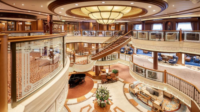 También te puede interesar: Fin de año en crucero - Queen Victoria: Inaugurado en 2007, el Queen Victoria es una joya de la flota de Cunard que fusiona el lujo contemporáneo con un diseño inspirado en la era victoriana. Este elegante barco tiene capacidad para 2,081 pasajeros y destaca por sus interiores refinados y espacios de relajación. Una de sus características más destacadas es el impresionante atrio de tres niveles, decorado con candelabros y elegantes escaleras que recuerdan a los grandes salones de baile. El Queen Victoria ofrece una experiencia de crucero íntima y relajada, ideal para quienes buscan elegancia y exclusividad. Los pasajeros pueden disfrutar de una serie de actividades que incluyen desde noches de cine al aire libre hasta catas de vinos en el Cunard Wine Academy. También cuenta con el lujoso Aquitania Spa, que ofrece una amplia gama de tratamientos relajantes, y el Queens Grill Lounge, un exclusivo salón para los pasajeros de las suites más selectas.