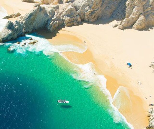 Playa del Amor, también conocida como Lovers Beach, está situada en el extremo de la Península de Baja California, donde el mar de Cortés se encuentra con el Océano Pacífico. Esta playa es una joya escondida entre formaciones rocosas imponentes, siendo el icónico Arco de Cabo San Lucas el más reconocible. El acceso es exclusivamente por mar, lo que añade una sensación de aventura a la experiencia. Aunque pequeña, Playa del Amor ofrece una intimidad y tranquilidad que pocos lugares pueden igualar. El contraste entre las aguas calmadas del lado del Mar de Cortés y las poderosas olas del Pacífico en la playa adyacente conocida como Playa del Divorcio, es asombroso. Este rincón mágico es perfecto para parejas que buscan un entorno romántico o para aquellos que simplemente quieren disfrutar de un lugar espectacularmente bello y aislado.