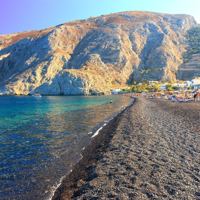 - Kamari Beach: Conocida por sus arenas negras volcánicas y su paseo marítimo lleno de tiendas y restaurantes. Es perfecta para una experiencia completa de playa y cultura local.