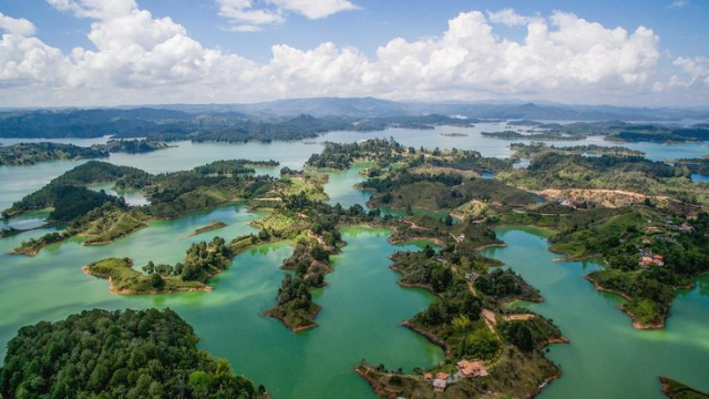 - Embalse de Guatapé: El embalse de Guatapé, también conocido como el embalse Peñol, es una vasta y pintoresca reserva de agua situada en el departamento de Antioquia, Colombia. Formado en la década de 1970 para generar energía hidroeléctrica, el embalse se ha convertido en un popular destino turístico. Sus aguas tranquilas están rodeadas por un paisaje montañoso exuberante, ofreciendo un entorno ideal para actividades recreativas como paseos en lancha, kayak y paddleboard. Además de su belleza natural, el embalse brinda espectaculares vistas desde la cima de la Piedra del Peñol, haciendo de Guatapé un destino imprescindible para amantes de la naturaleza y la aventura.